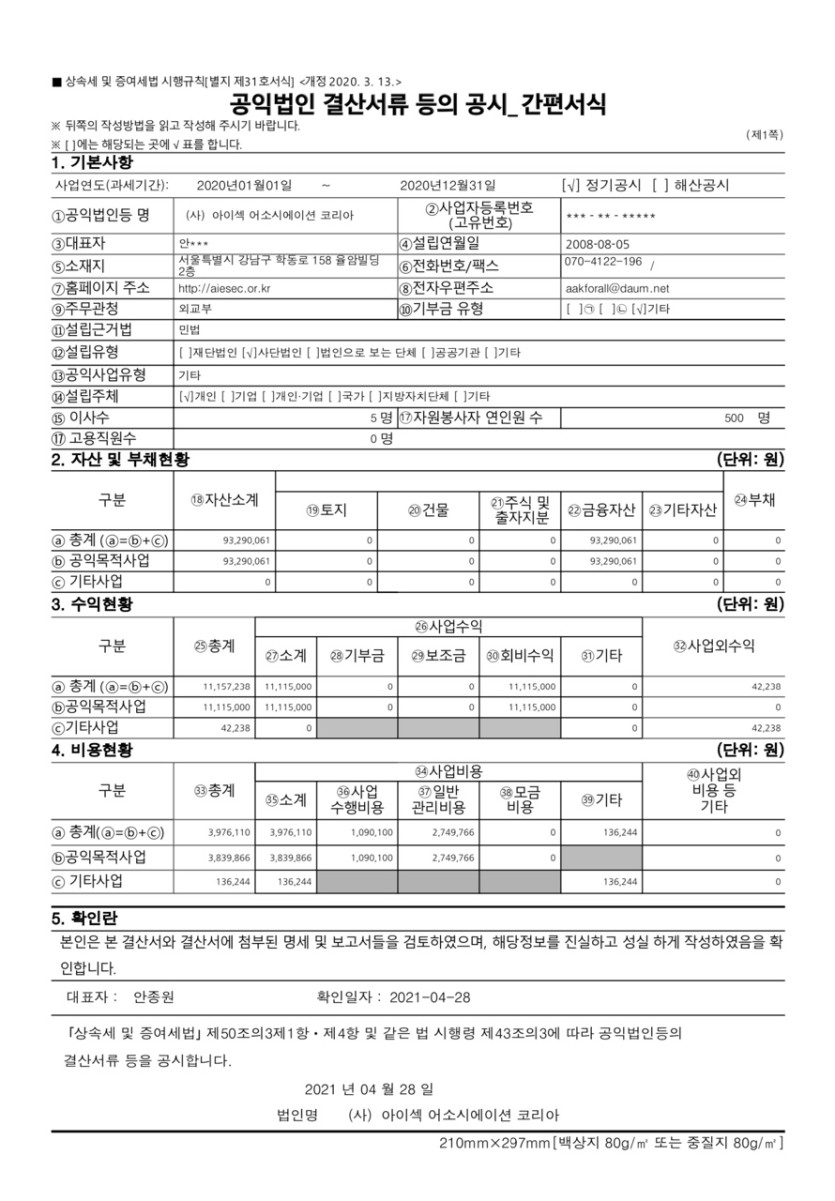 2020년도 AAK 공익법인 결산서류 등의 공시 (외교부)